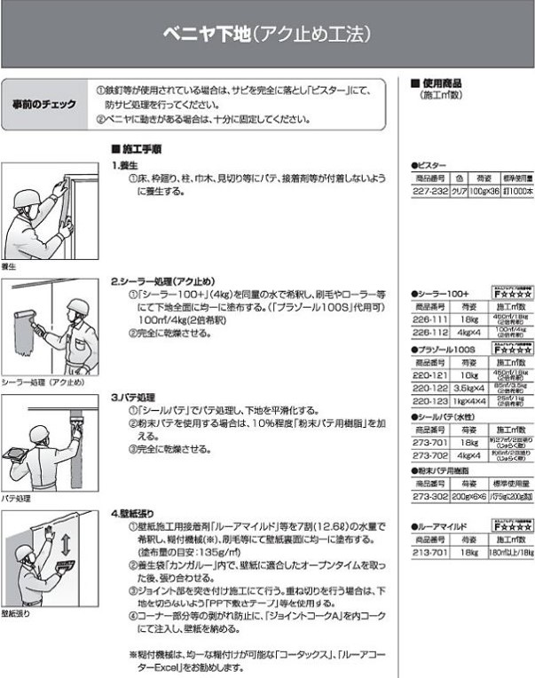 ⑤「シーラー100+」は、アク止め効果を有する、特殊合成樹脂エマルションです。「プラゾールSS」「プラゾール503S」や他