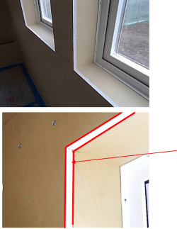 サッシ巻き込み部、ニッチ等の、の石膏ボードの貼り方は正面ボード勝ちとする