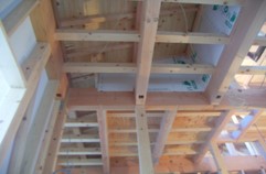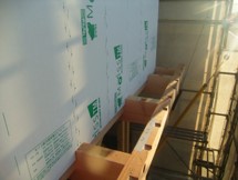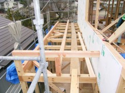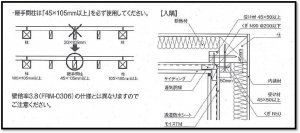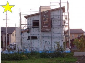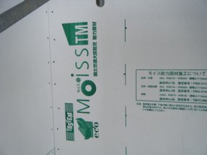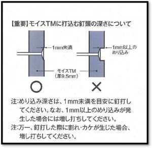 下屋部分は垂木掛けの施工前にモイスの施工をする。 使用釘N-50 釘ピッチ 周辺部100㎜ 中間部200㎜ モイス施工状況 入れ隅部は忘れずに下地を入れ、固定する。 ※下屋、ベランダ部分は垂木掛け等の施工前にモイスの施工をする。 耐力壁が筋交いのみでとられている場合は 下屋上ベニヤ先行張りの上 気密シート貼りの後、モイス貼りでよい。 モイス施工後状況、全景 柱頭柱脚金物前の記事 建て方:養生次の記事