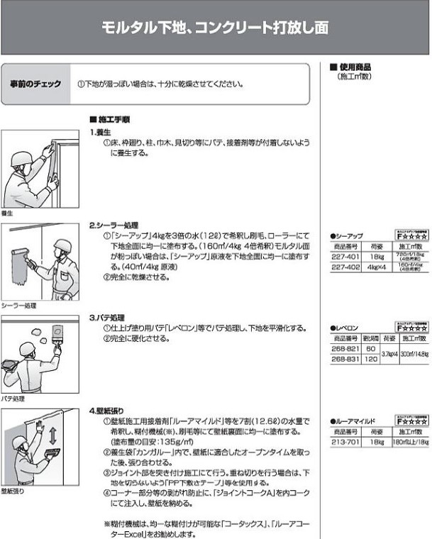 ⑧極端に湿度が高くなる環境下、あるいは伸縮性の大きい壁紙を施工される場合などは、「ルアーマイルド」等の壁紙施工