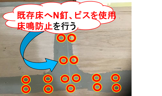 既存床材へN釘、ビスを使用し既存床材の床鳴防止を行う