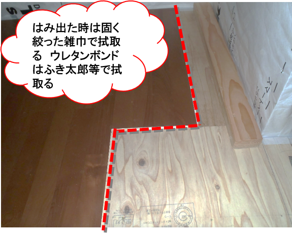 床板を追い込んだ時にボンドがはみ出ないよう注意。はみ出た時は固く絞った雑巾で拭取る ウレタンボンドはふき太郎等で拭取る