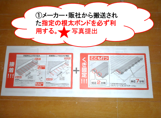 ①使用する根太ボンド合板フローリングを貼る場合、メーカー・販社から搬送された指定の根太ボンドを必ず利用する。