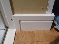 既製巾木の掃き出しサッシ及び、巾木を途中で止める場合は見付部をトメ加工とする。