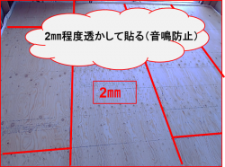 床捨てコンパネは2㎜程度透かして貼る(音鳴防止)柱、間柱部分も透かす