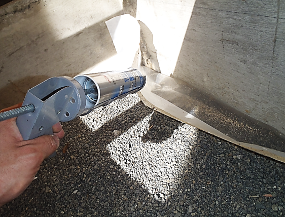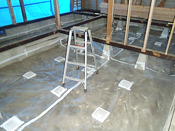 基礎の立ち上がり部分の土間シート張りは気密テープだと剥がれるのでブチルシール、もしくはコーキング材を使用する。