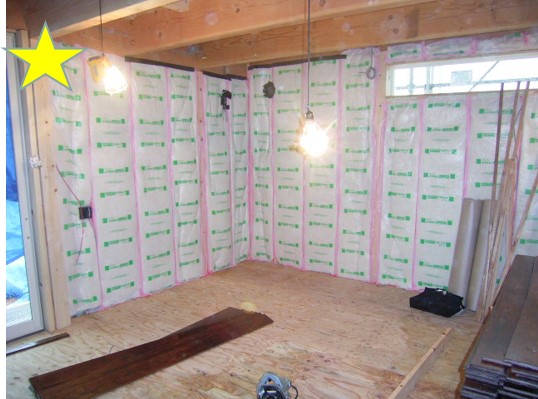 グラスウール施工状況 グラスウールは隙間のないように柱及び間柱に入れ、 耳はタッカーにて垂直になるよう下地に取り付ける 同上 全景 カット面小口が出る場合は5~10mm程大きく切断する 配管、配線が躯体を貫通する穴の周囲は、気密テープ等をはりまわしてふさぐ事 ダウンライト施工状況 断熱:セルロース前の記事 断熱:ウレタン次の記事
