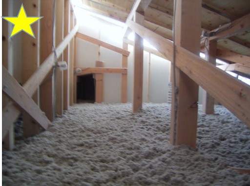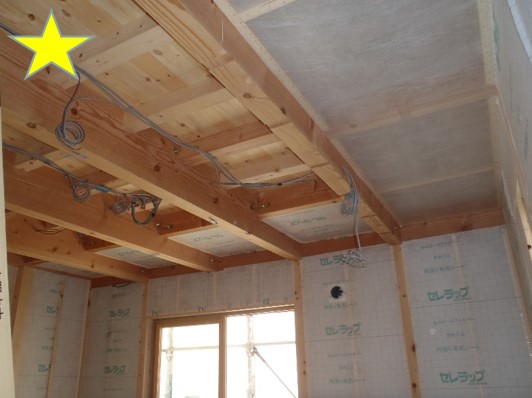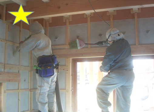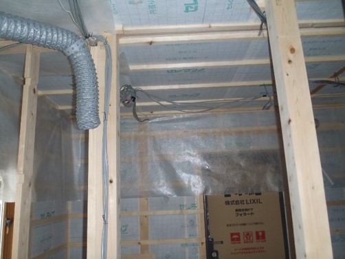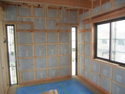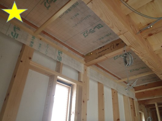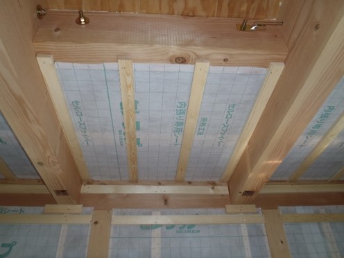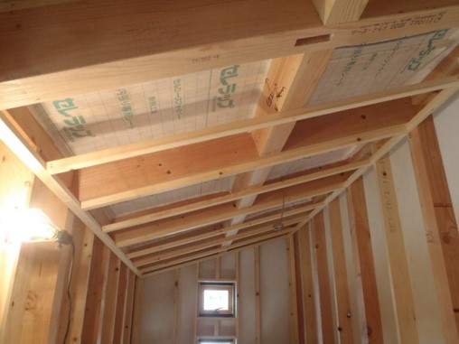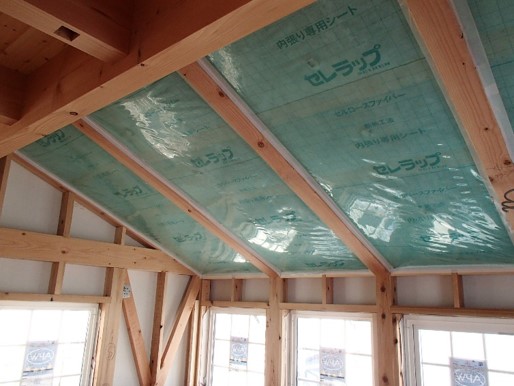 不織布貼りの上、セルロース吹込み後、0.2気密シート貼り。