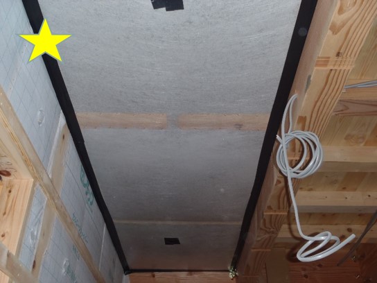 防湿シート0.2㎜貼りの上端部、タッカー箇所に気密テープ貼りの事。