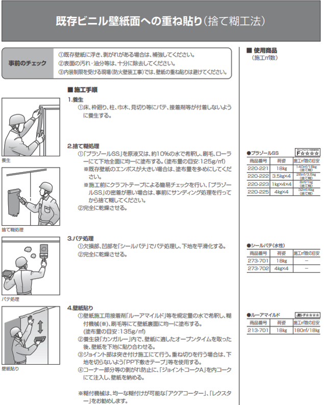 ③下地壁紙が、フィルムコーティング壁紙(汚れ防止壁紙)の場合、事前にサンディング処理を行ってから捨て糊してください④「プラゾールSS」を使用する際は事前に下地へ試験塗布し、乾燥後クラフトテープを貼り、剥離しないか確認した後、施工