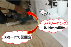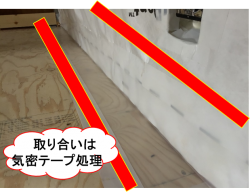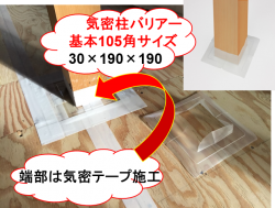 日本住環境気密部材使用 柱脚部気密確保の為気密柱バリアーを施工端部は気密テープ施工 床と壁、壁と天井、外壁と間仕切壁など気密防湿層を連続する為 メバリーロングシートを使用 シートの折れ線よりL字型に折り曲げて使用する ジョリパット:エンシェントブリック前の記事 ジョリパット役物関係次の記事