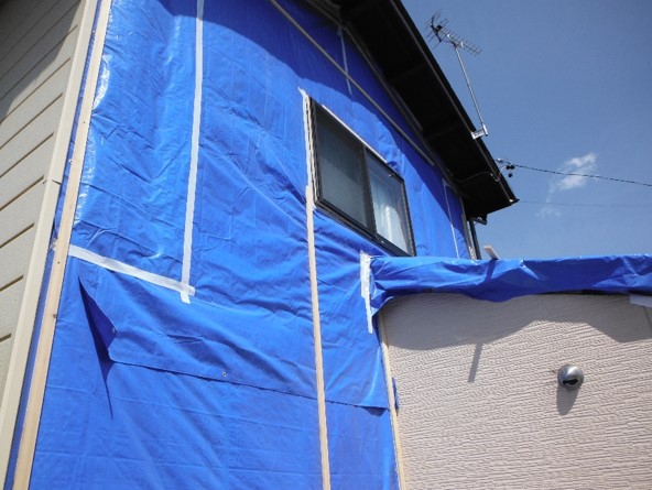 解体作業完了後、その日のうちにブルーシート、場合により木材にてシート押えを行い