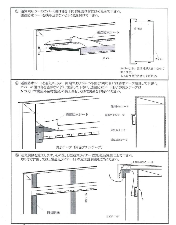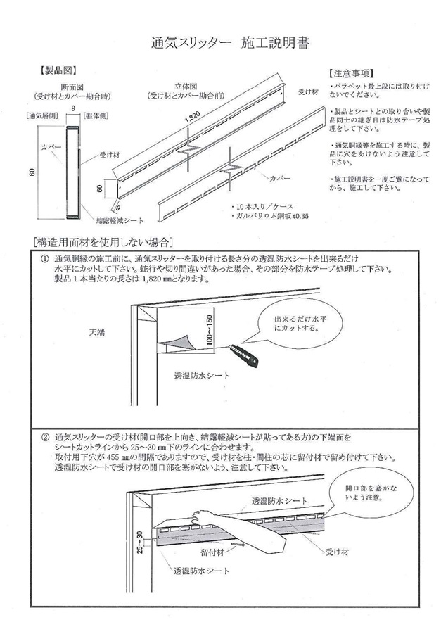 ゼロキューブでの使用例 パラペット内側の構造用合板をカットし捨てルーフィングを施工する ルーフィング上からスリッター受け材の取付 その際、通気口の確保を確実に行うこと 本体カバーをはめ込む 新築施工マニュアル【軒天下地】★マークは写真提出前の記事 床組・床下地次の記事