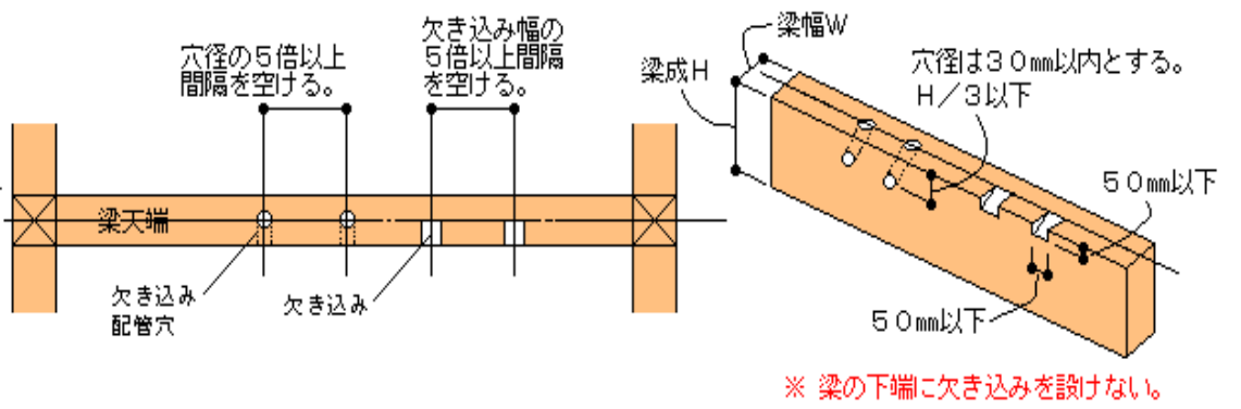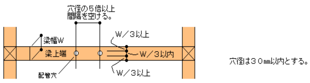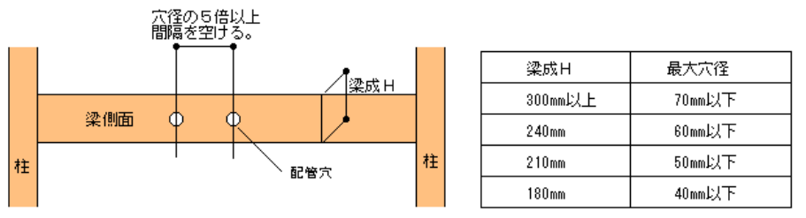 梁、柱貫通は基本NG 〇梁の側面 梁一側面に穴をあける場合は以下の内容を遵守して対応する。 〇梁の天端 梁一天端に書き込みを行う場合は、以下の内容を遵守して対応する。 〇柱の側面 柱一側面に穴をあける場合は以下の内容を遵守して対応する。 屋内給水給湯前の記事 ウレタン吹き付け施工前の注意事項次の記事