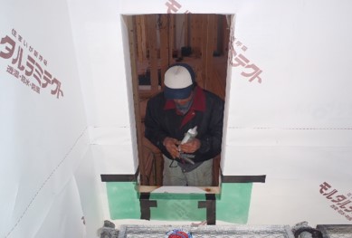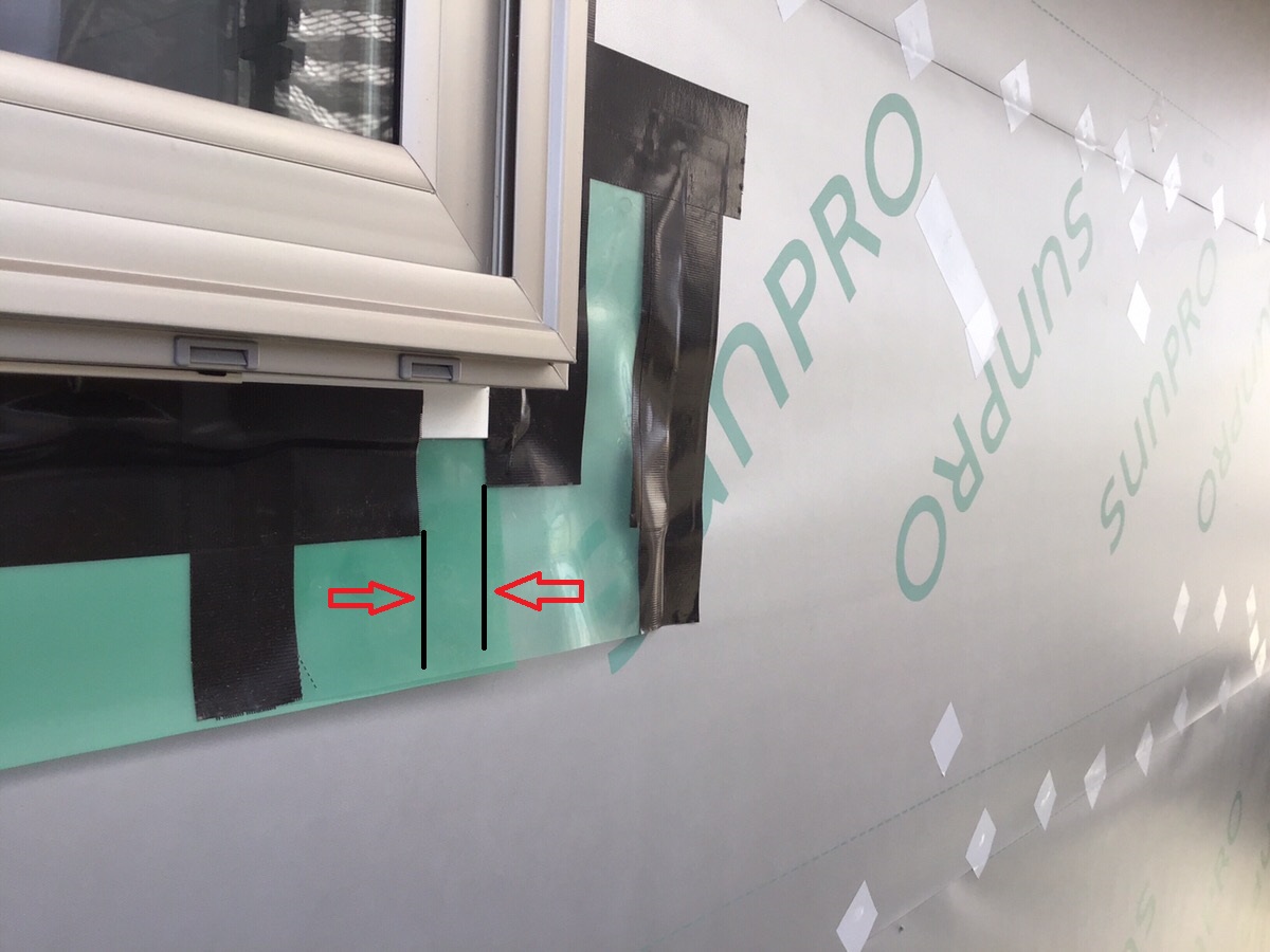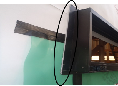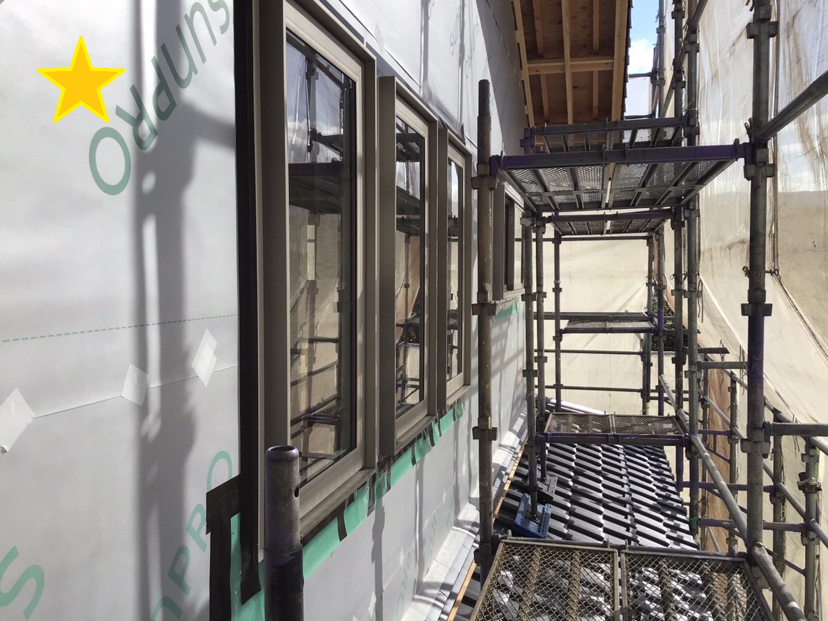 ④サッシ取り付け後、サッシ羽根部(横、上)のみブチルシール施工