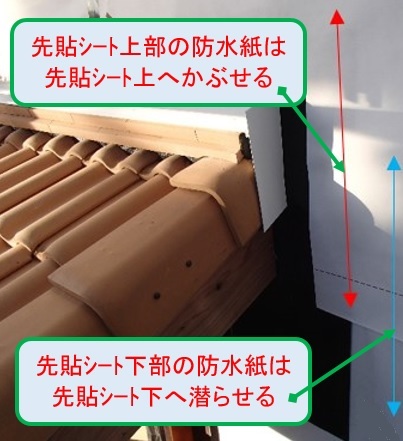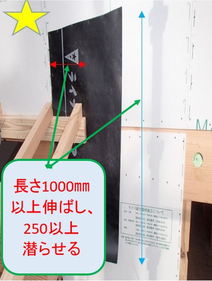 下屋などの外壁取合は モイス施工後 先貼りシートを施工する。 長さ1.000以上伸ばし 250以上もぐらせる ↑先張りシート上部の防水紙は ↓先張りシート上へ被せ ↑先張りシート下部の防水紙は ↓先張りシート下へ潜らせる 木口はブチル系テープ貼り 〇先張りシート施工後 (水上) (水下) 防水:防水紙前の記事 マモリー次の記事