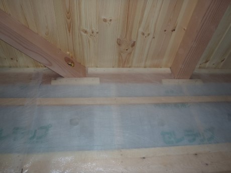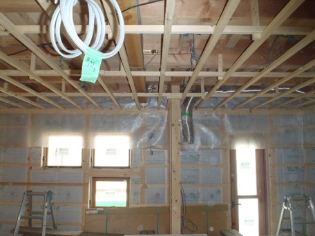 気密工事 ペーパバリア 重ねは200㎜以上 2F 施工状況 ボード貼り以前にペーパーバリアを先に入れておくこと 断熱材施工部が覆いかぶさるように施工する 1F 天井有り 施工状況 天井下地組み以前にペーパーバリアを先に入れておくこと 壁下地前の記事 断熱:考え方次の記事