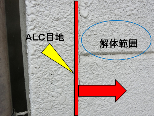 既存ALC壁のサッシ入れ替えなどによる解体工事範囲はALC目地(ALCパネルごと柱、間柱部下地)ごとに解体を行う。